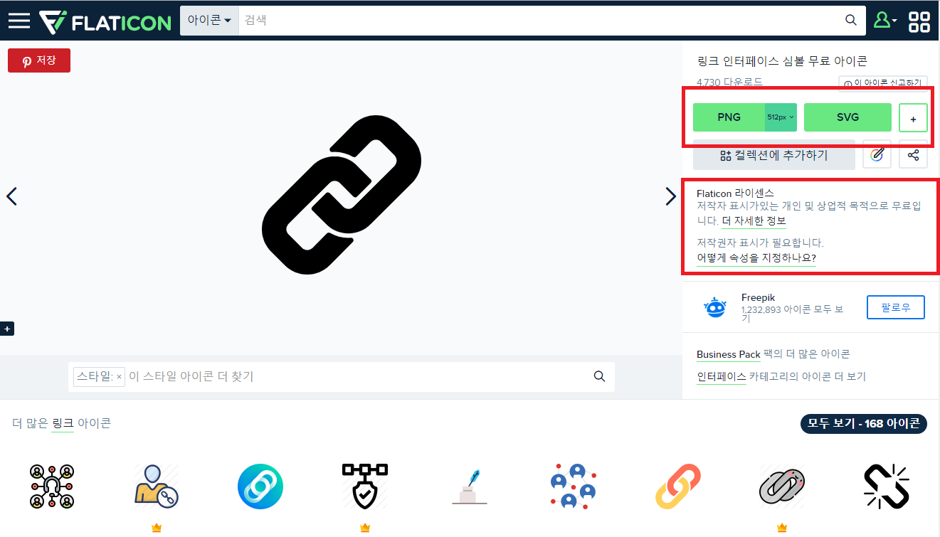 사이트마다 다운로드 할 수 있는 파일의 형식이 다릅니다. 저는 SVG로 다운로드하였습니다. 벡터 이미지로 크기를 늘려도 깨지지 않습니다.