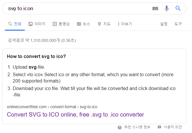 Google 에서 "online image converter" 또는 "svg to icon"으로 검색합니다. 변환하려는 파일의 형식에 따라 적절하게 검색어를 변경합니다. 저는 많이 쓰는 검색어가 "png to ico", "svg to icon"입니다. 여러 사이트들이 검색되는데 적당한 사이트에 방문하시면 됩니다. 대부분 비슷한 UI와 기능으로 구성되어 있습니다.