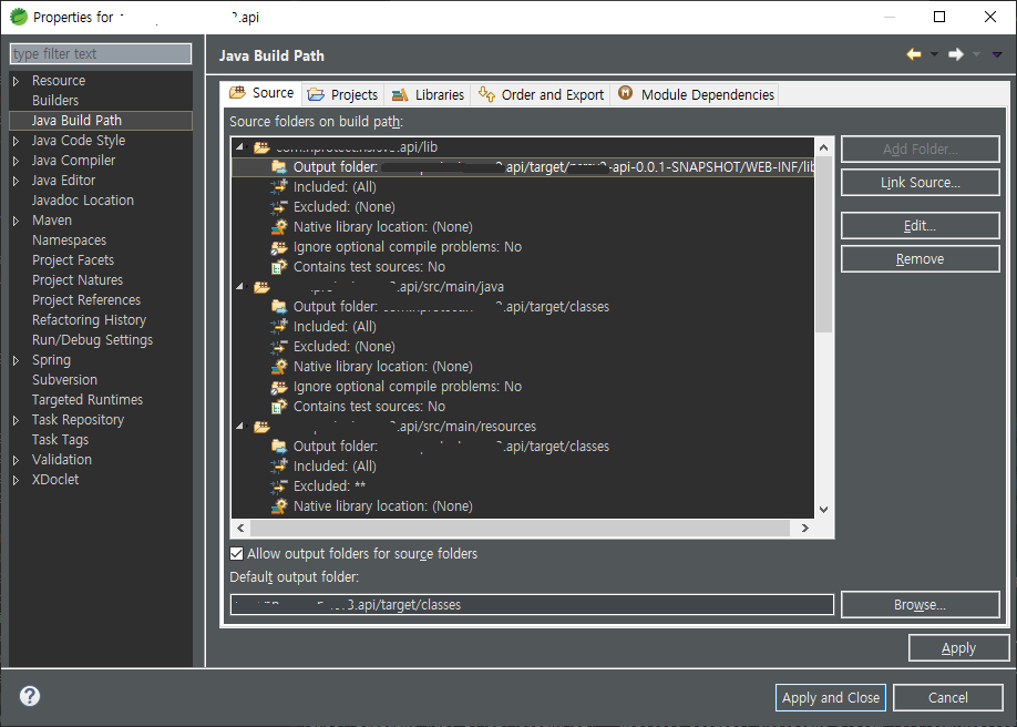 Output folder 의 경로는 project.name/target/war.package.name/WEB-INF/lib 로 설정해야 합니다.