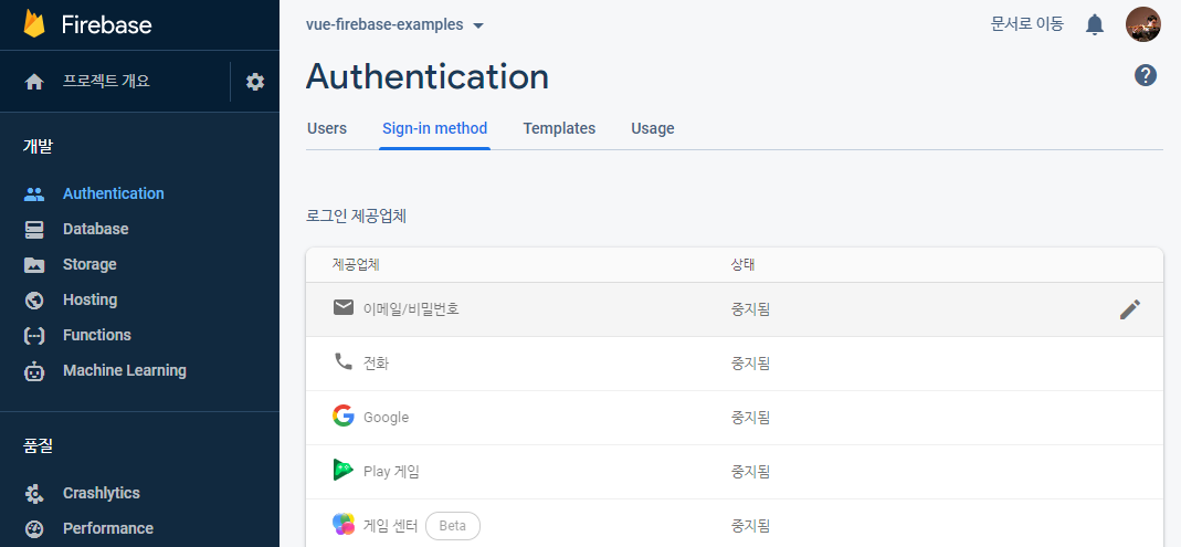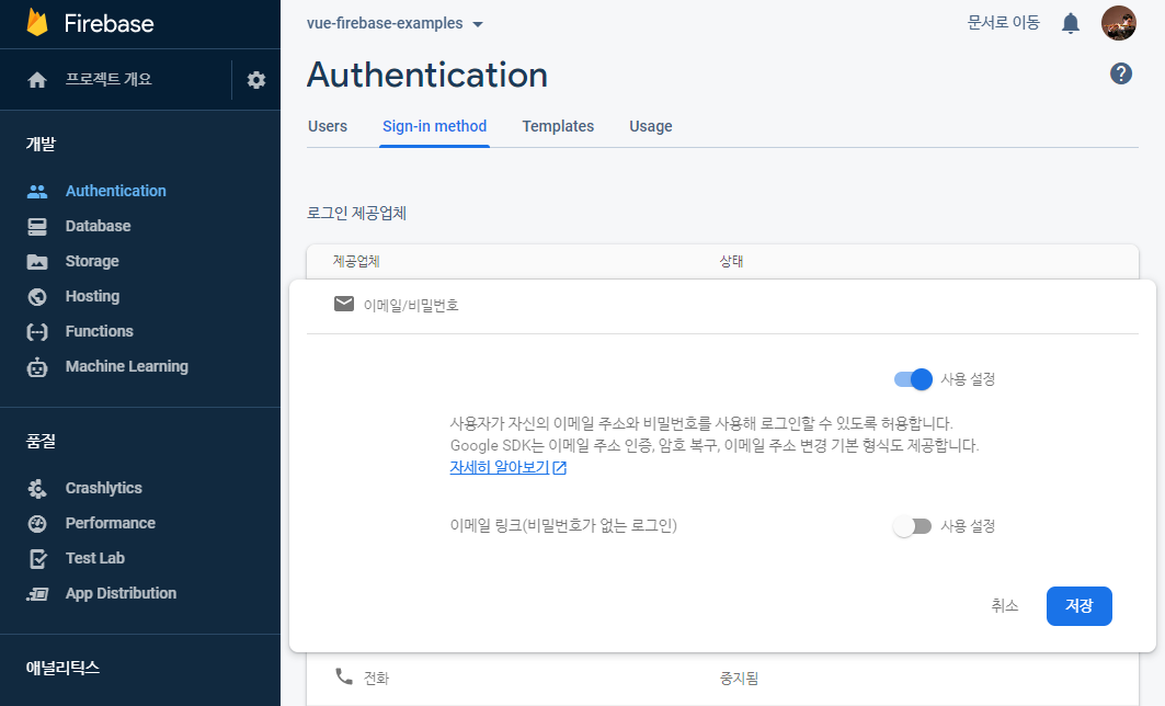 이메일/비밀번호 인증 사용설정