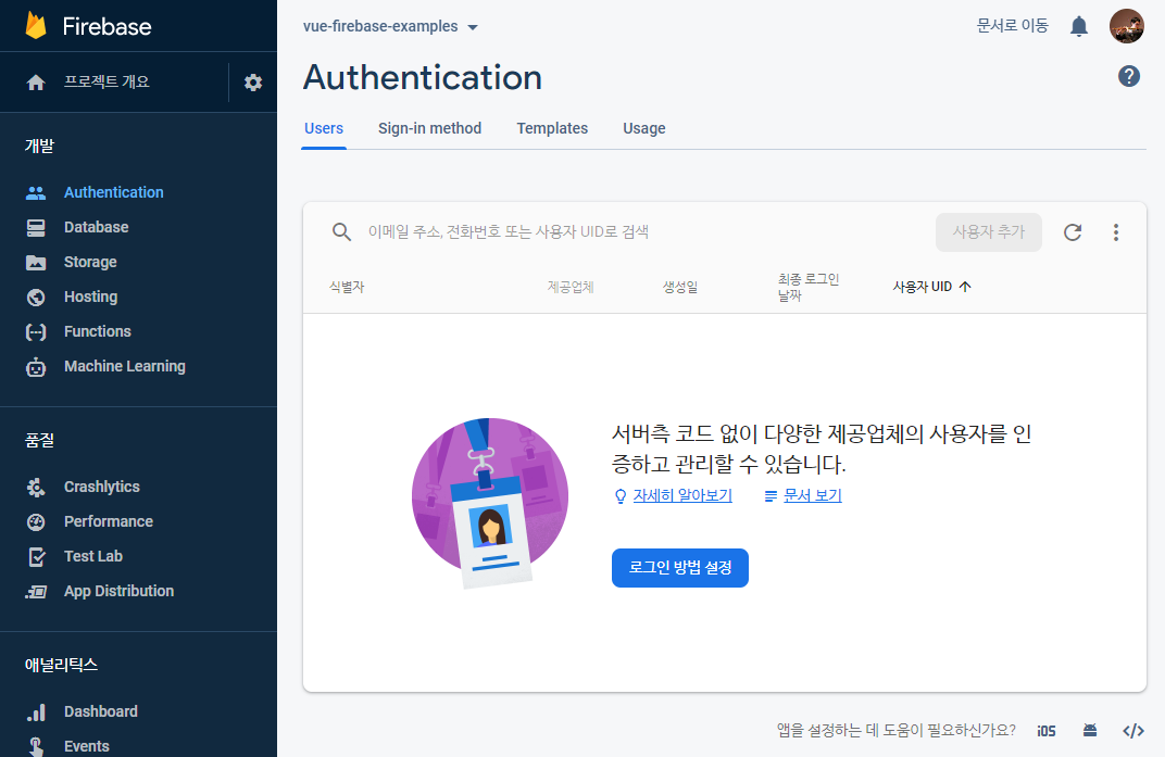 프로젝트 설정에서 Authentication을 클릭하고 화면에서 [로그인방법 설정]을 클릭합니다.