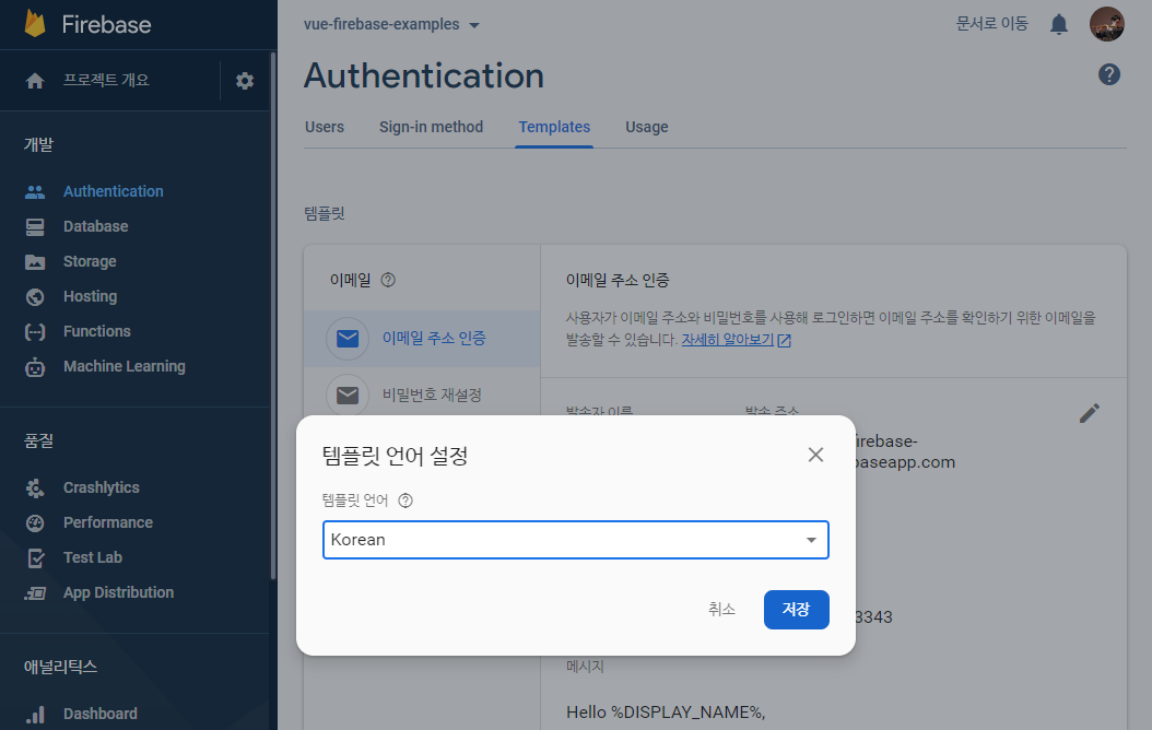Authentication 설정에서 Templates를 선택합니다. 하단의 템플릿언어를 선택하고 수정하고자 하는 언어를 선택합니다.