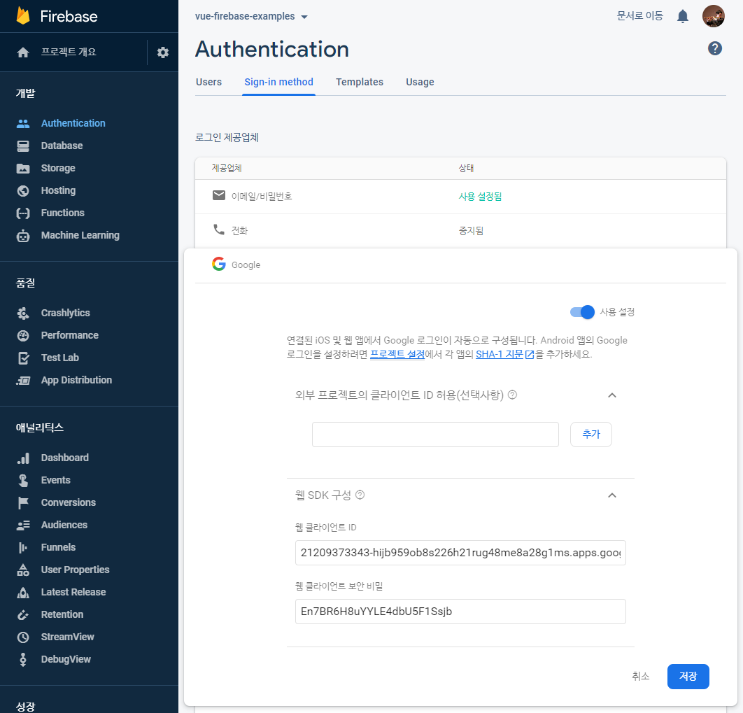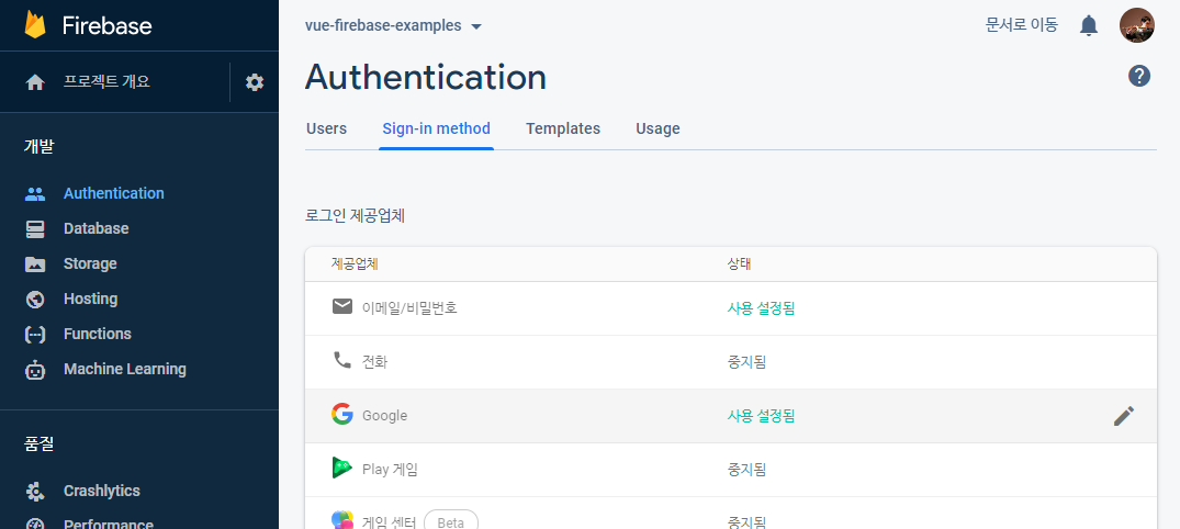 [프로젝트 설정 > Authentication > Sign-in method]에서 Google를 활성화시킵니다. Firebase는 자동으로 Google과 연동되어 있어 별도의 설정이 필요 없습니다. 추가적인 앱의 권한을 요청하려면 Google APIs 페이지에 접속하여 권한을 부여해야 합니다. https://console.developers.google.com/