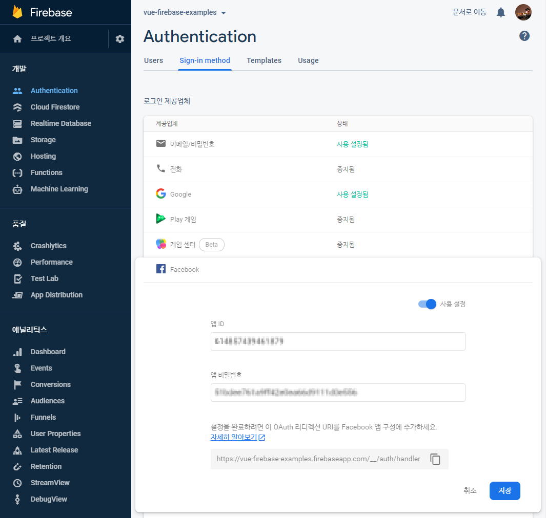 페이스북 프로젝트 설정 > Authentication > Sign-in method에서 페이스북 로그인을 사용 설정합니다. 이때 페이스북 앱 ID와 앱 시크릿코드가 필요합니다. 그리고 파이어 베이스 OAuth 리디렉션 URI를 복사합니다.
