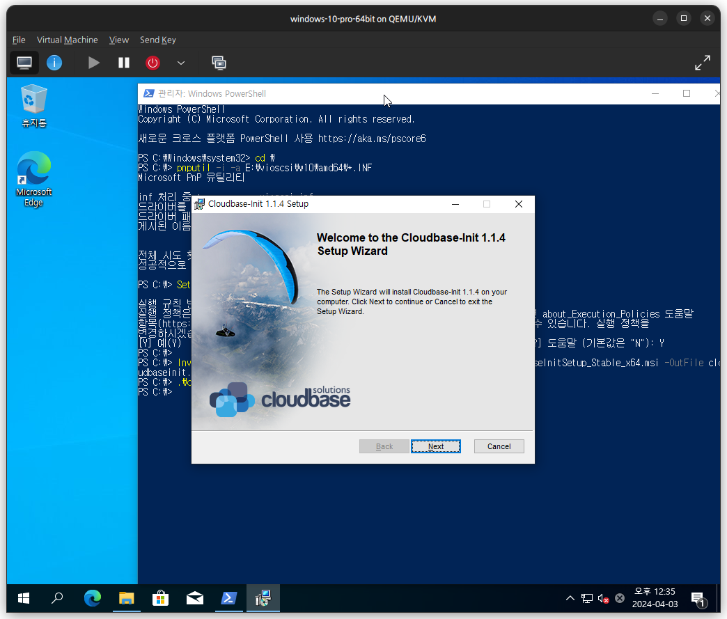 운영체제 설치 이후에 다음의 명령을 수행하여 cloudbase-init 모듈을 설치합니다. 드라이버 등록시 INF 파일은 운영체제 버전별로 경로가 다르니 설치된 운영체제에 따라 다르게 설정합니다.