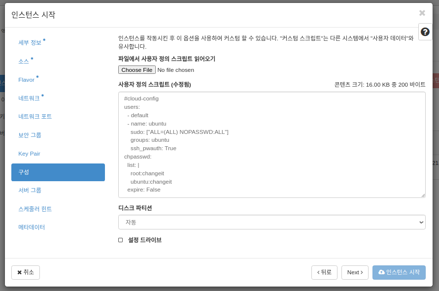 Openstack에서 인스턴스 생성시에 사용자 계정을 초기화하므로 사용자 계정을 추가하도록 “구성” 과정에 아래와 같이 사용자 정의 스크립트를 추가합니다. 이 때 최상단의 #cloud-config 주석을 삭제하면 안됩니다. Openstack에서 사용자 정의스크립트로 인식하지 않습니다.