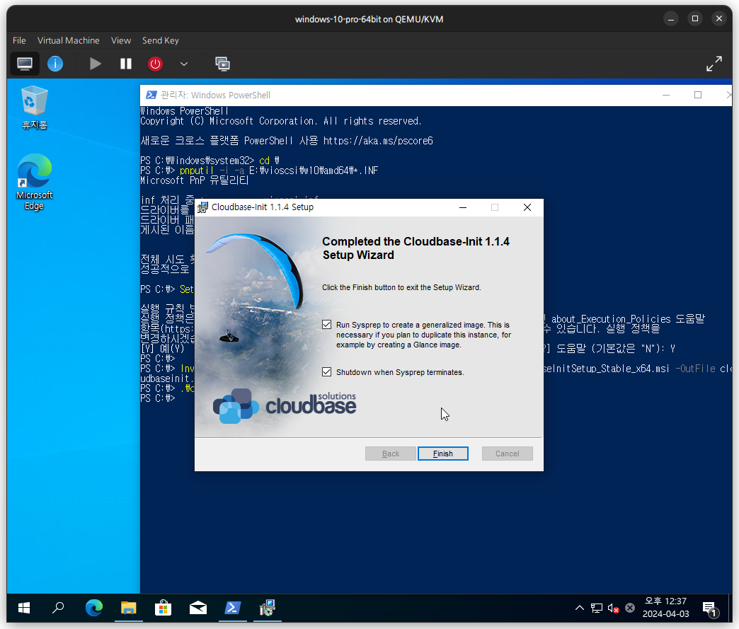 Cloudbase-init 프로그램 종료시에 Sysprep와 종료 체크박스를 선택하여 마무리합니다.
